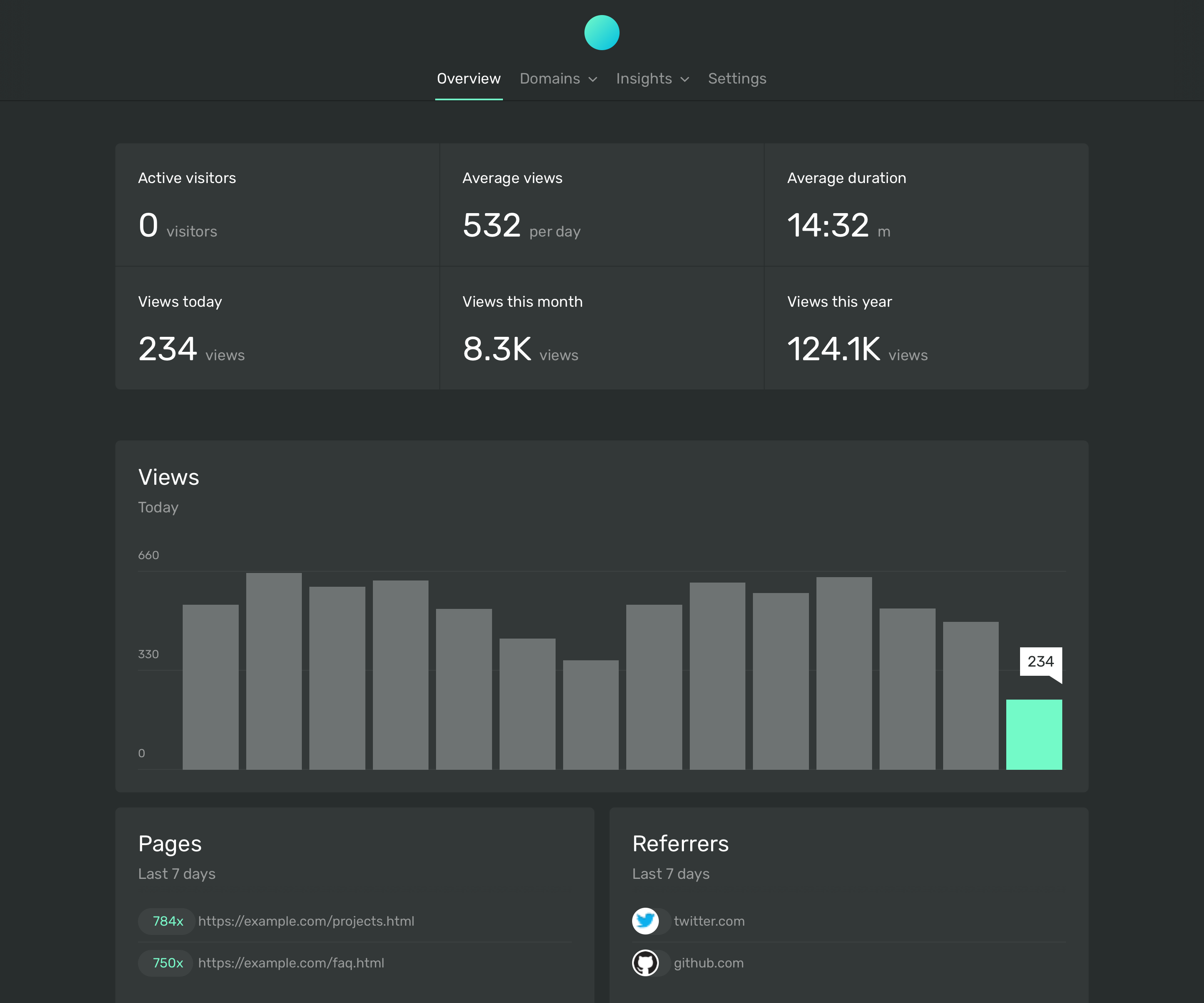 - Insights: Ackee offers insights into views, referrers, durations and more, providing all the details you need to understand your website's traffic.